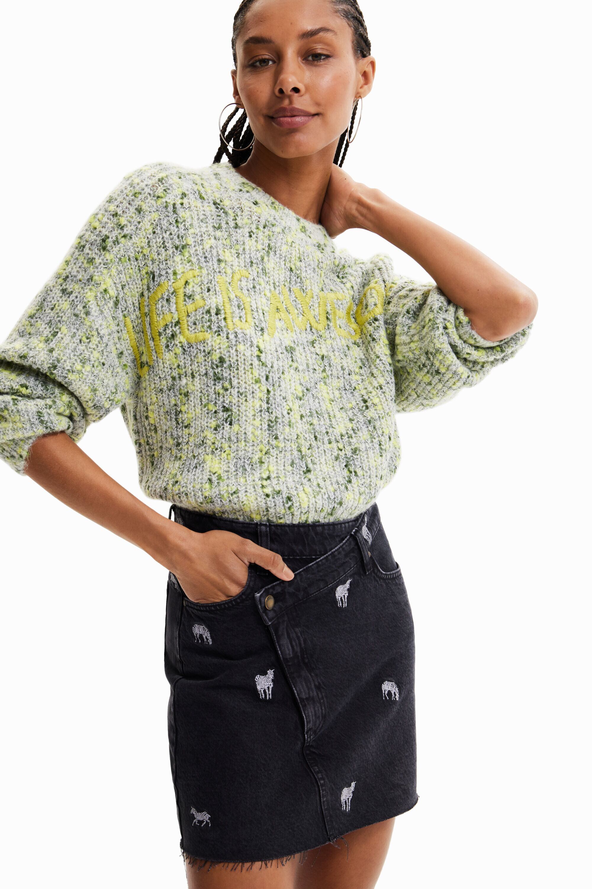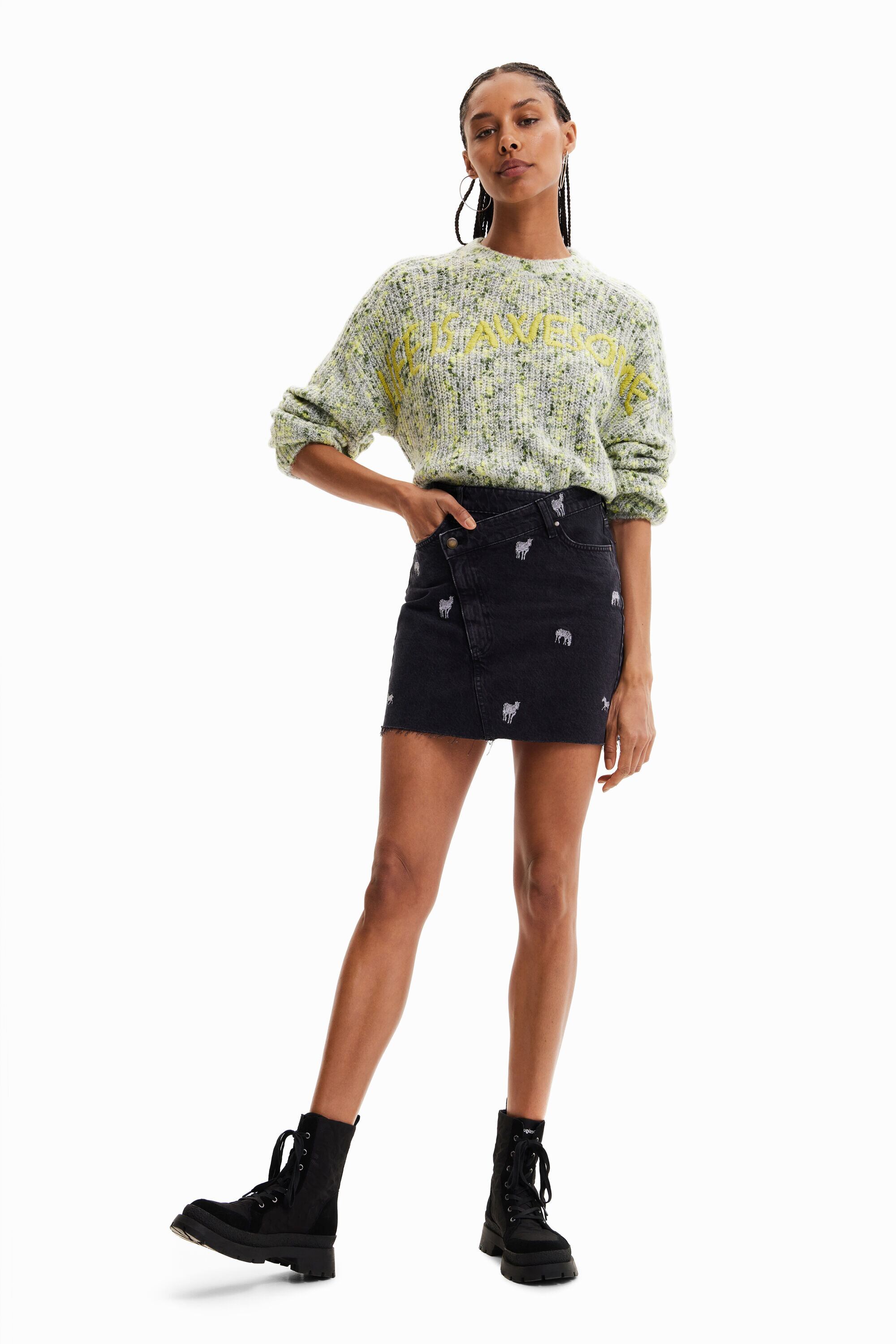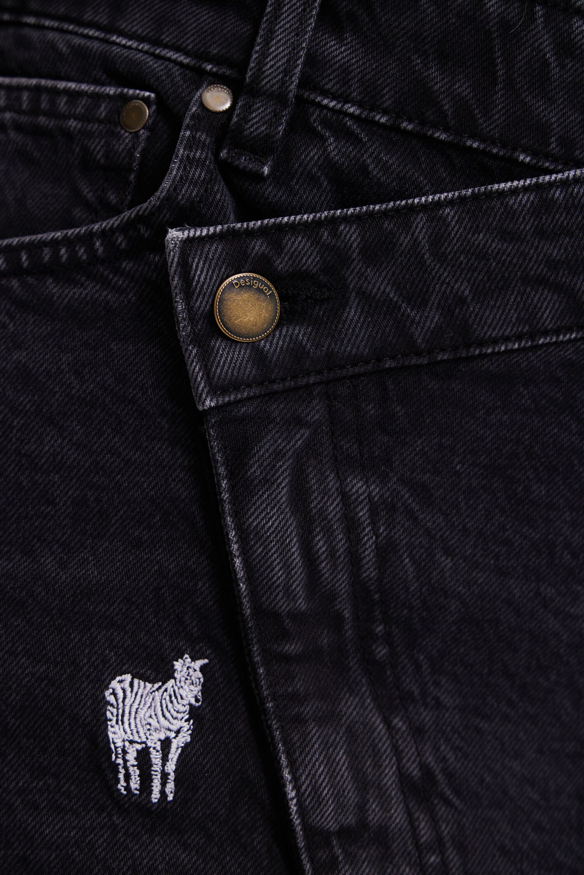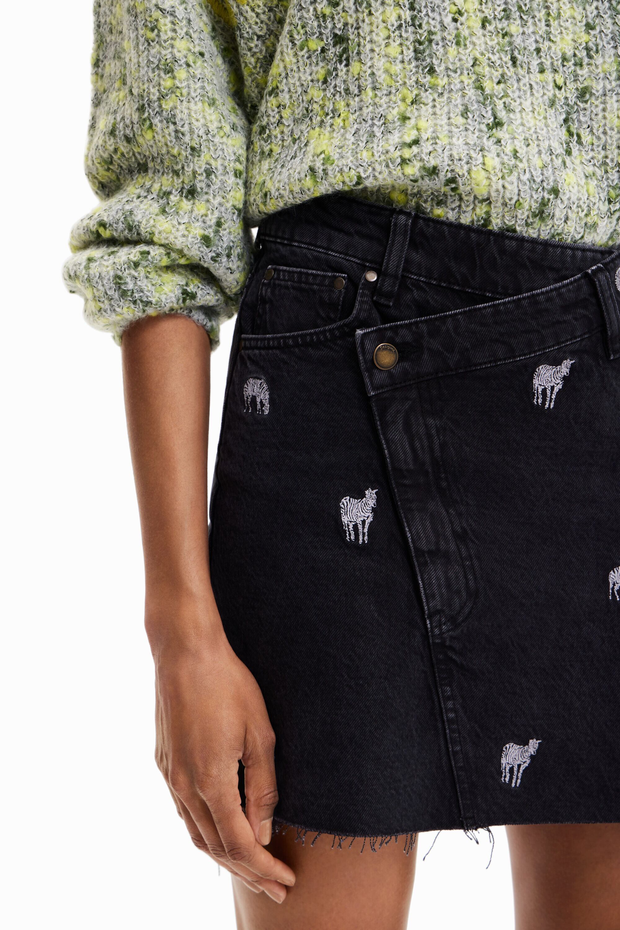 控えめなAラインシルエットのボタンデニムミニスカート。ウエスト部分は魅力的なクロスデザインで、ゼブラモチーフの刺繍と、裾はラフカットで仕上げました。