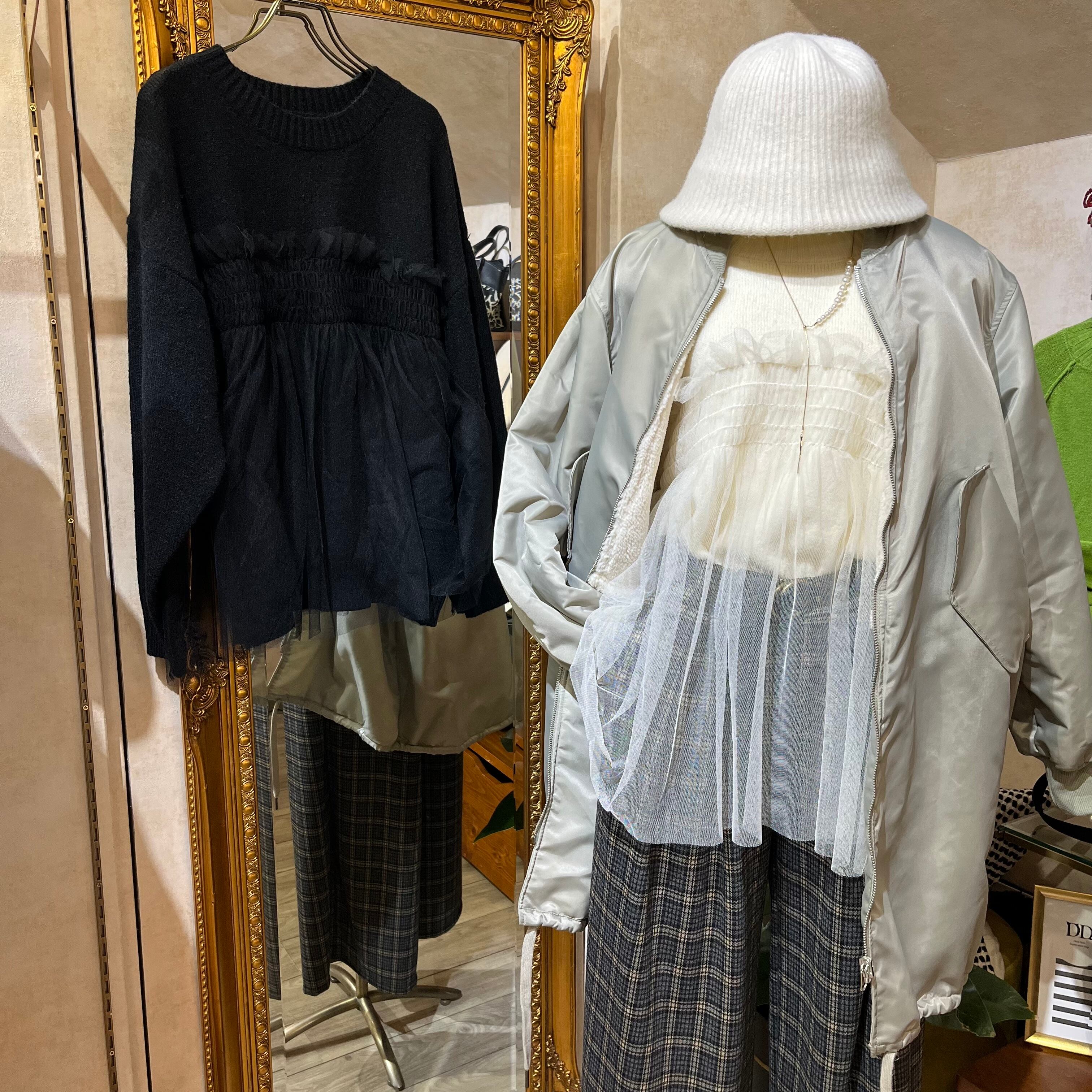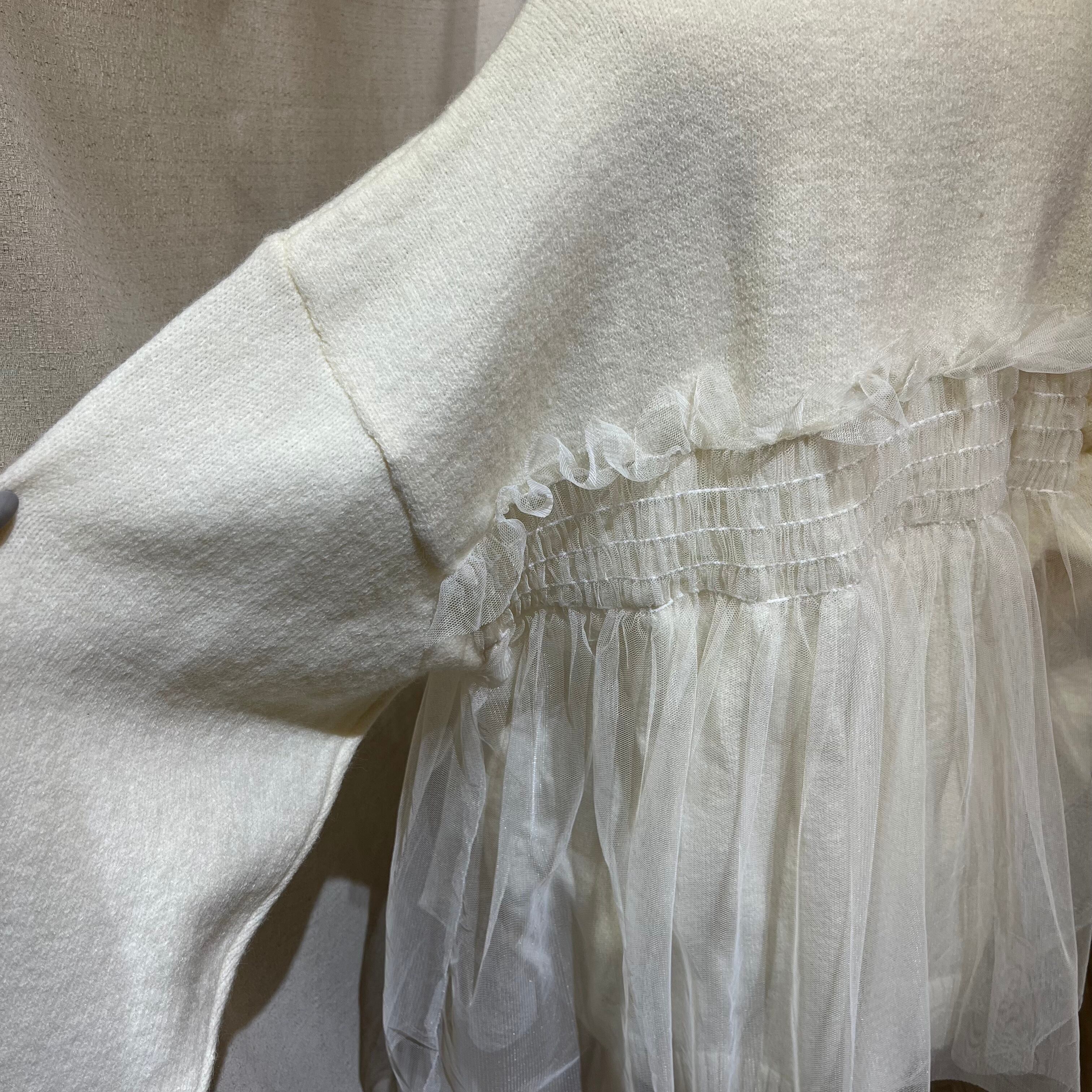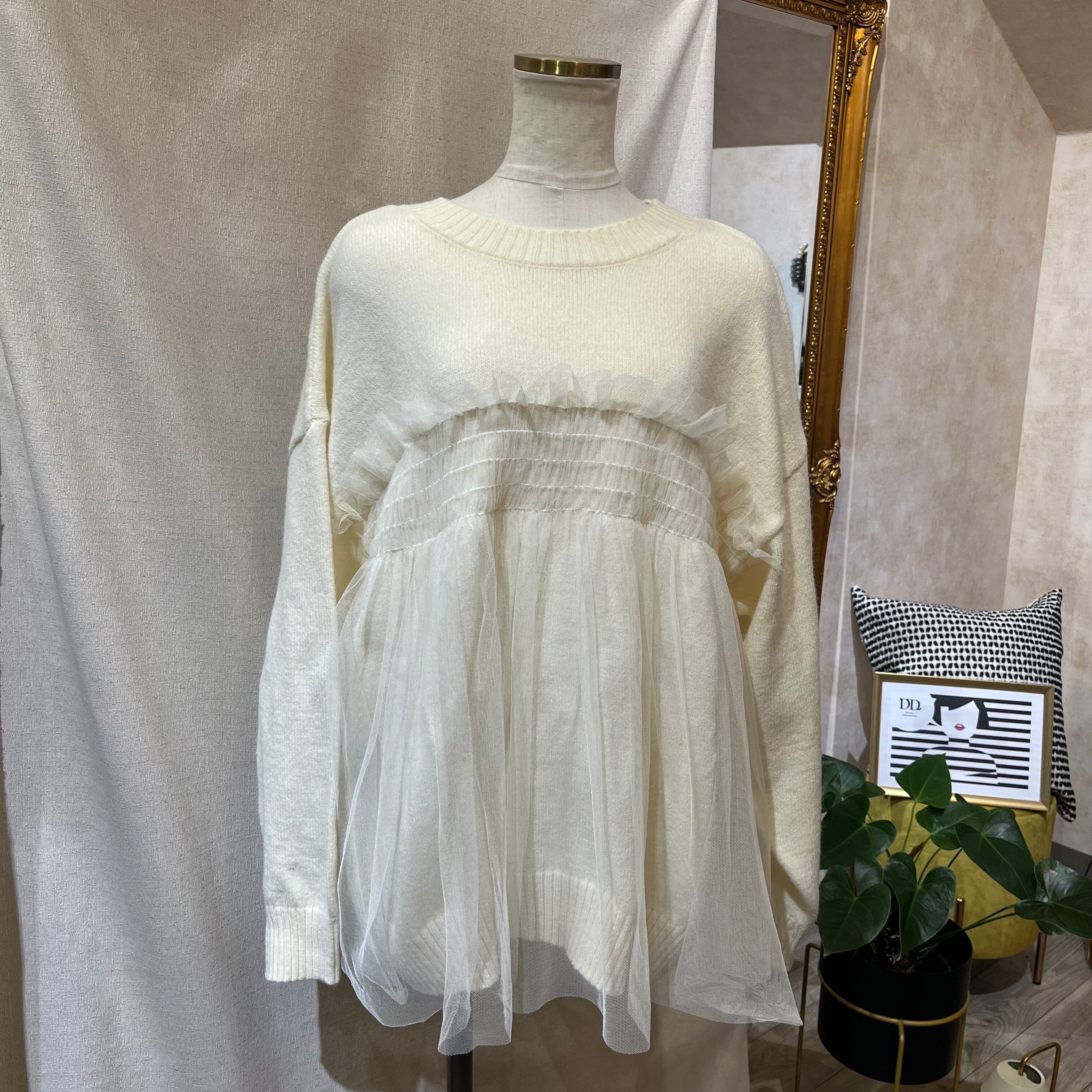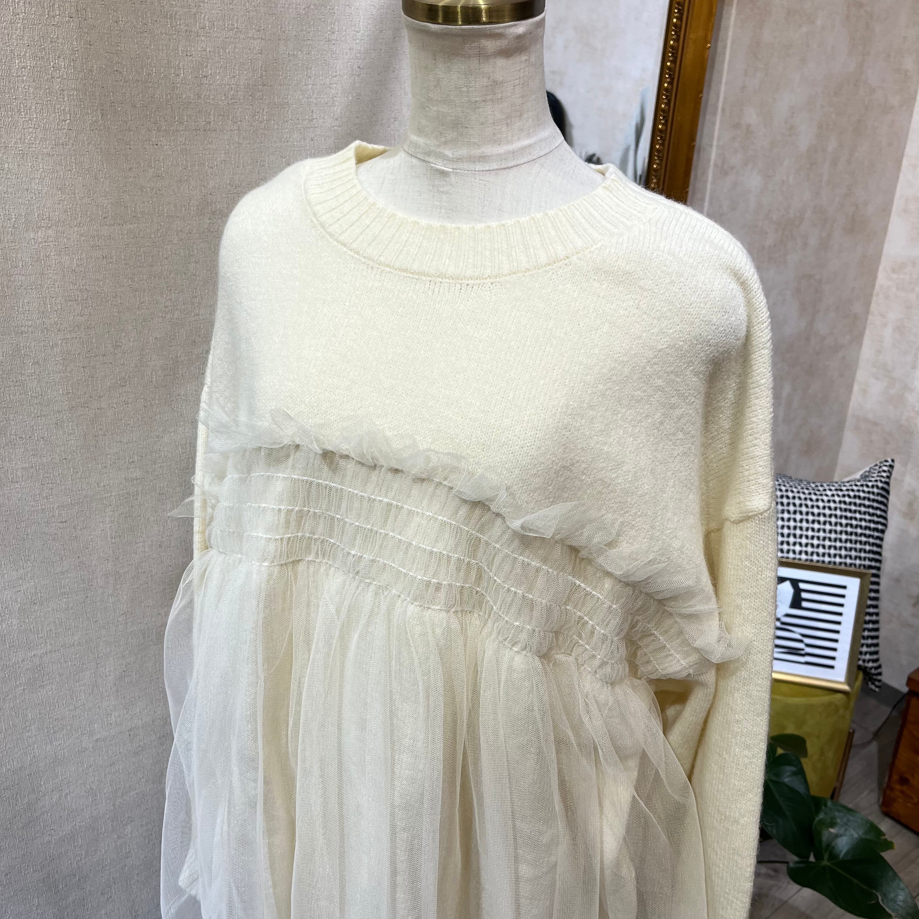チュールのビスチェとニットがドッキングしたデザインのニットトップスです。